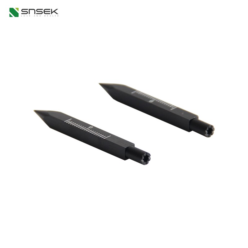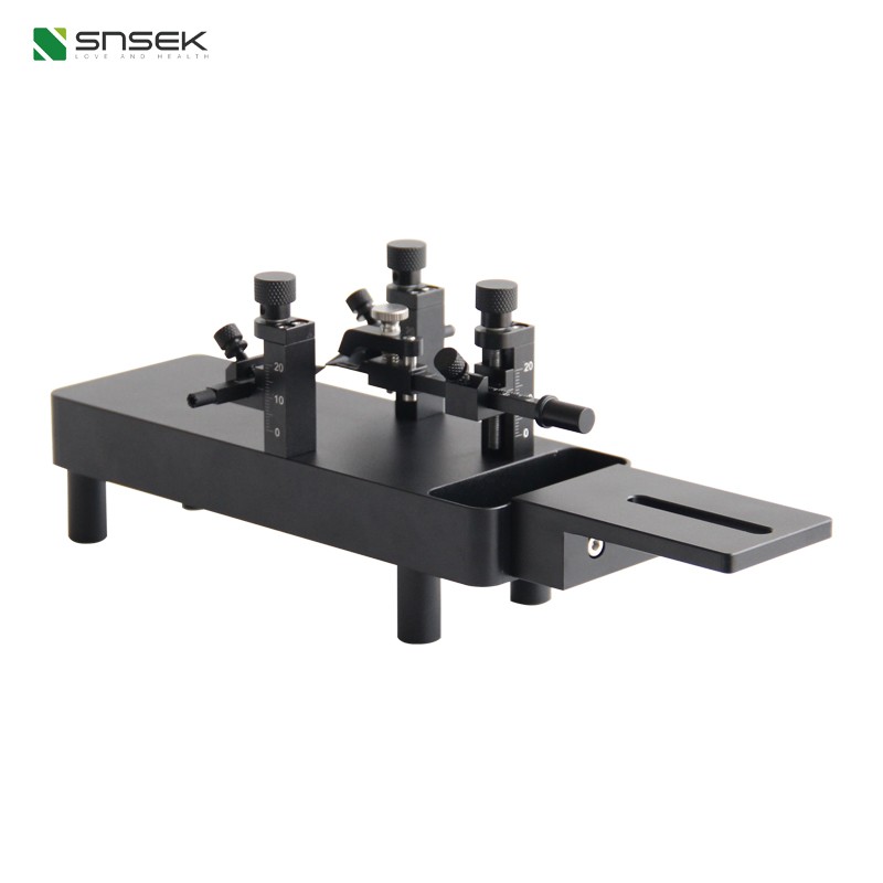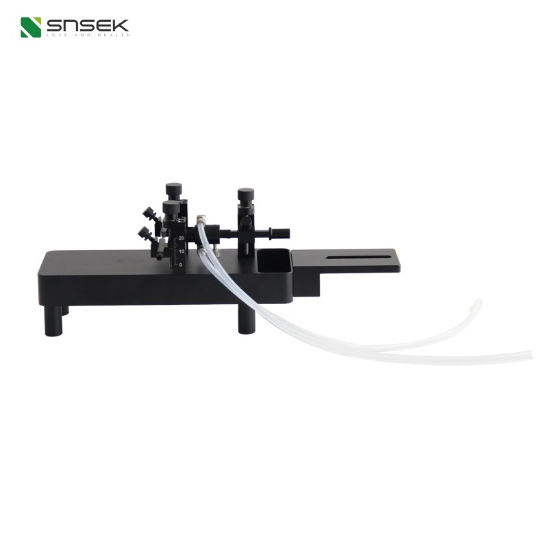 The tip of the newborn mouse brain fixation adapter is appropriately tapered, which can not only firmly clamp the mouse head, but also avoid the damage to the mouse skull caused by using stainless steel as ear bars. The height of the ear bars on both sides and the height of the incisor clamp can be freely adjusted and have scales, which are suitable for experiments at different angles. As the young mice do not have ear canals, a zygomatic bone fixation sleeve is added to replace the tip ear bar, providing a non-invasive and stable fixation method for the young mouse's head.